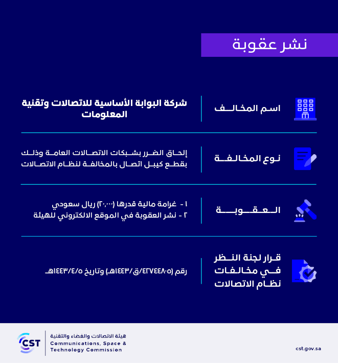 The Communications, Space and Technology Commission publishes the decision of the Committee for Reviewing Communications System Violations No. (42744805/Q/1443 AH) regarding (Basic Gateway Communications and Information Technology Company)’s violation of the communications system.