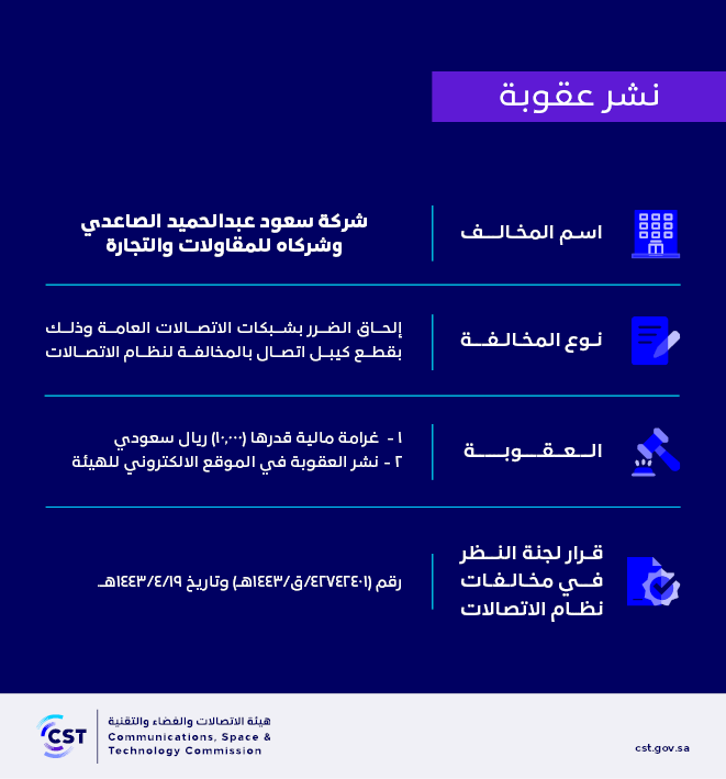 The Communications, Space and Technology Commission publishes the decision of the Committee for Reviewing Communications System Violations No. (42742401/Q/1443 AH) regarding (Saud Abdul Hameed Al-Saedi and Partners Company for Contracting and Trading) violating the communications system.