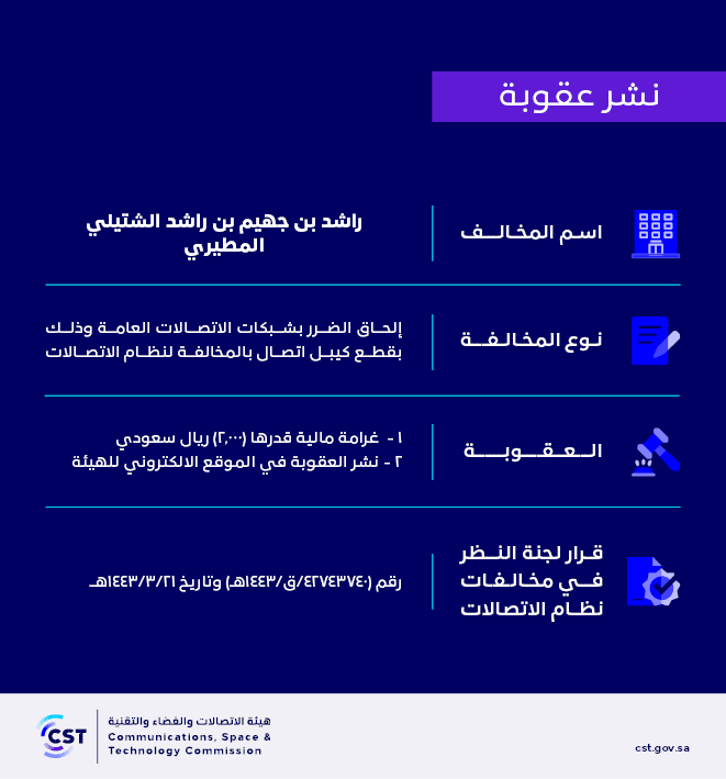 The Communications, Space and Technology Commission publishes the decision of the Committee for Review of Communications System Violations No. (42743740/Q/1443 AH) regarding (Rashid bin Juhaim bin Rashid Al Shatili Al Mutairi) violating the communications system.