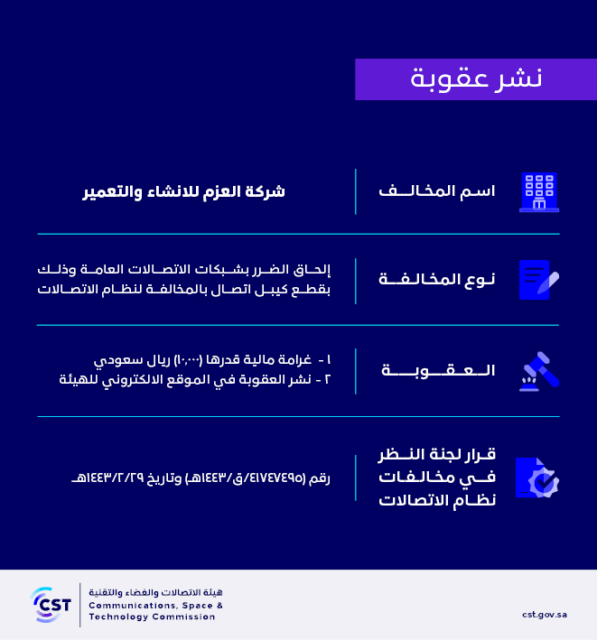 The Communications, Space and Technology Commission publishes the decision of the Committee for Review of Communications System Violations No. (41747495/Q/1443 AH) regarding (Al-Azm Construction and Development Company)’s violation of the communications system.