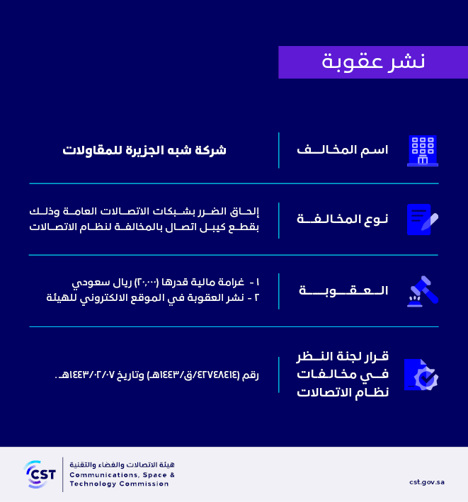 The Communications, Space and Technology Commission publishes the decision of the Committee for Review of Communications System Violations No. (42748414/Q/1443 AH) regarding (Peninsula Contracting Company)’s violation of the communications system.