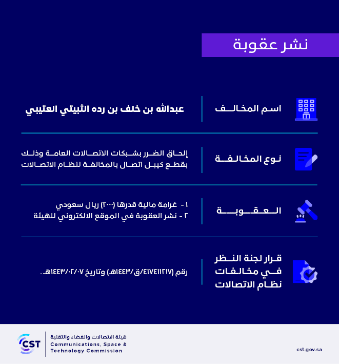 The Communications, Space and Technology Commission publishes the decision of the Committee for Review of Communications System Violations No. (417411217/Q/1443 AH) regarding (Abdullah bin Khalaf bin Radha Al-Thubaiti Al-Otaibi) violating the communications system.