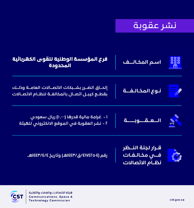 The Communications, Space and Technology Commission publishes the decision of the Committee for Reviewing Communications System Violations No. (41742504/Q/1443 AH) regarding (the branch of the National Electric Power Corporation Limited) violating the communications system.