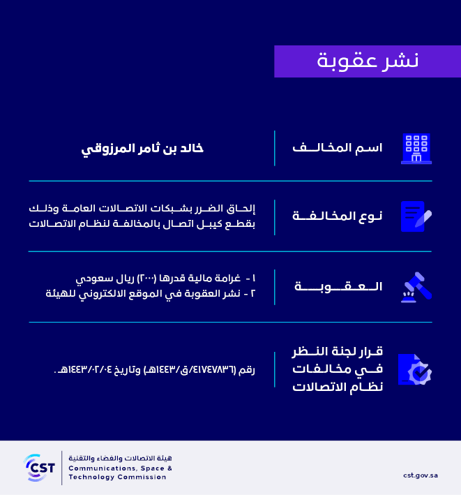 The Communications, Space and Technology Commission publishes the decision of the Committee for Reviewing Communications System Violations No. (41747836/Q/1443 AH) regarding (Khalid bin Thamer Al-Marzouqi Al-Baqmi) violating the communications system.