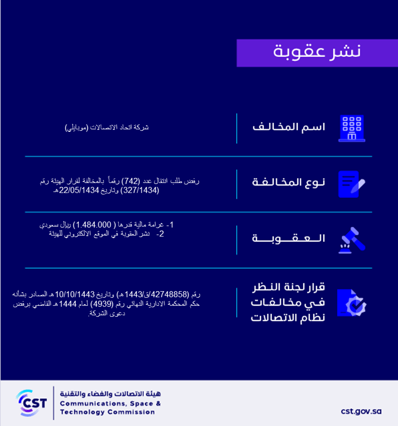 The Communications and Information Technology Commission publishes the decision of the Committee for Reviewing Communications System Violations No. (42748858/Q/1443 AH) regarding (Etihad Telecommunications Company (Mobily) violating the communications system.