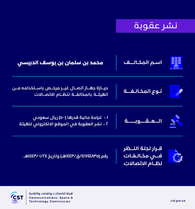 The Communications, Space and Technology Commission publishes the decision of the Committee for Review of Communications System Violations No. (41744835 / Q / 1443 AH) regarding (Mohammed bin Salman bin Youssef Al-Dabisi) violating the communications system