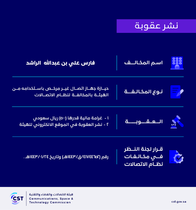 The Communications, Space and Technology Commission publishes the decision of the Committee for Review of Communications System Violations No. (41744652 / Q / 1443 AH) regarding (Faris Ali bin Abdullah Al-Rashed) violation of the communications system