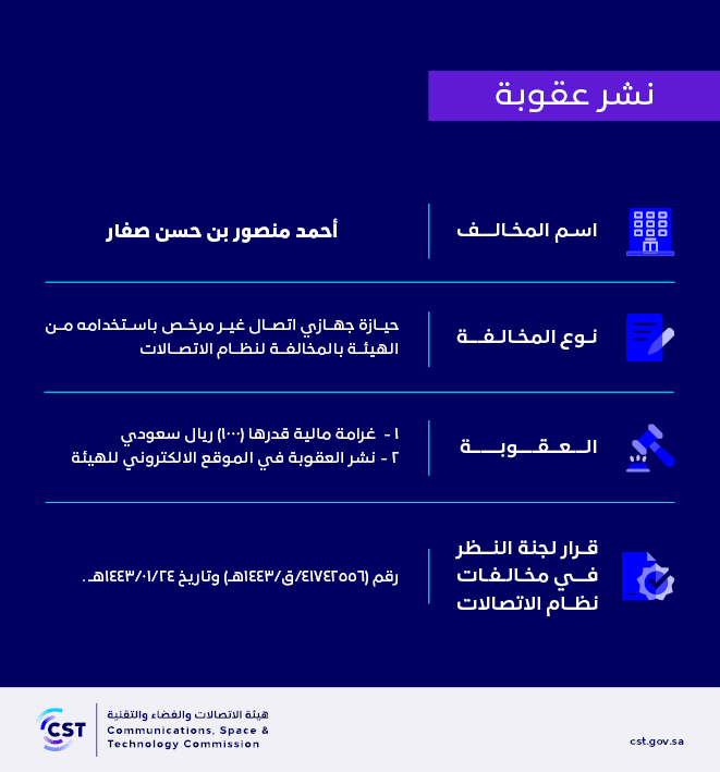 The Communications, Space and Technology Commission publishes the decision of the Committee for Review of Communications System Violations No. (41742556/Q/1443 AH) regarding Ahmed Mansour bin Hassan Al-Saffar’s violation of the communications system.