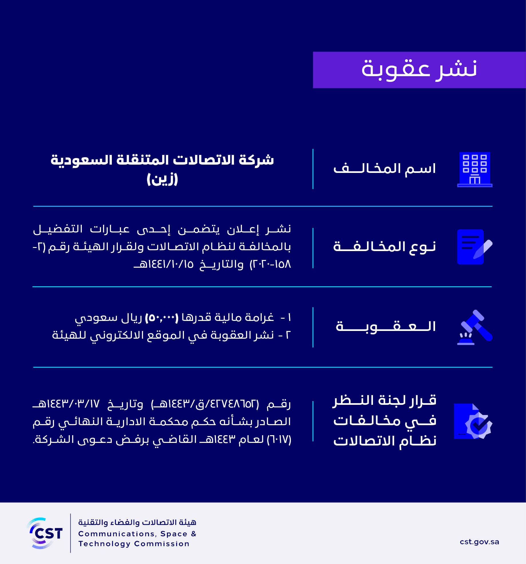 The Communications and Information Technology Commission publishes the decision of the Committee for Review of Communications System Violations No. (42748652/Q/1443 AH) regarding (Saudi Mobile Telecommunications Company - Zain) violation of the communications system.