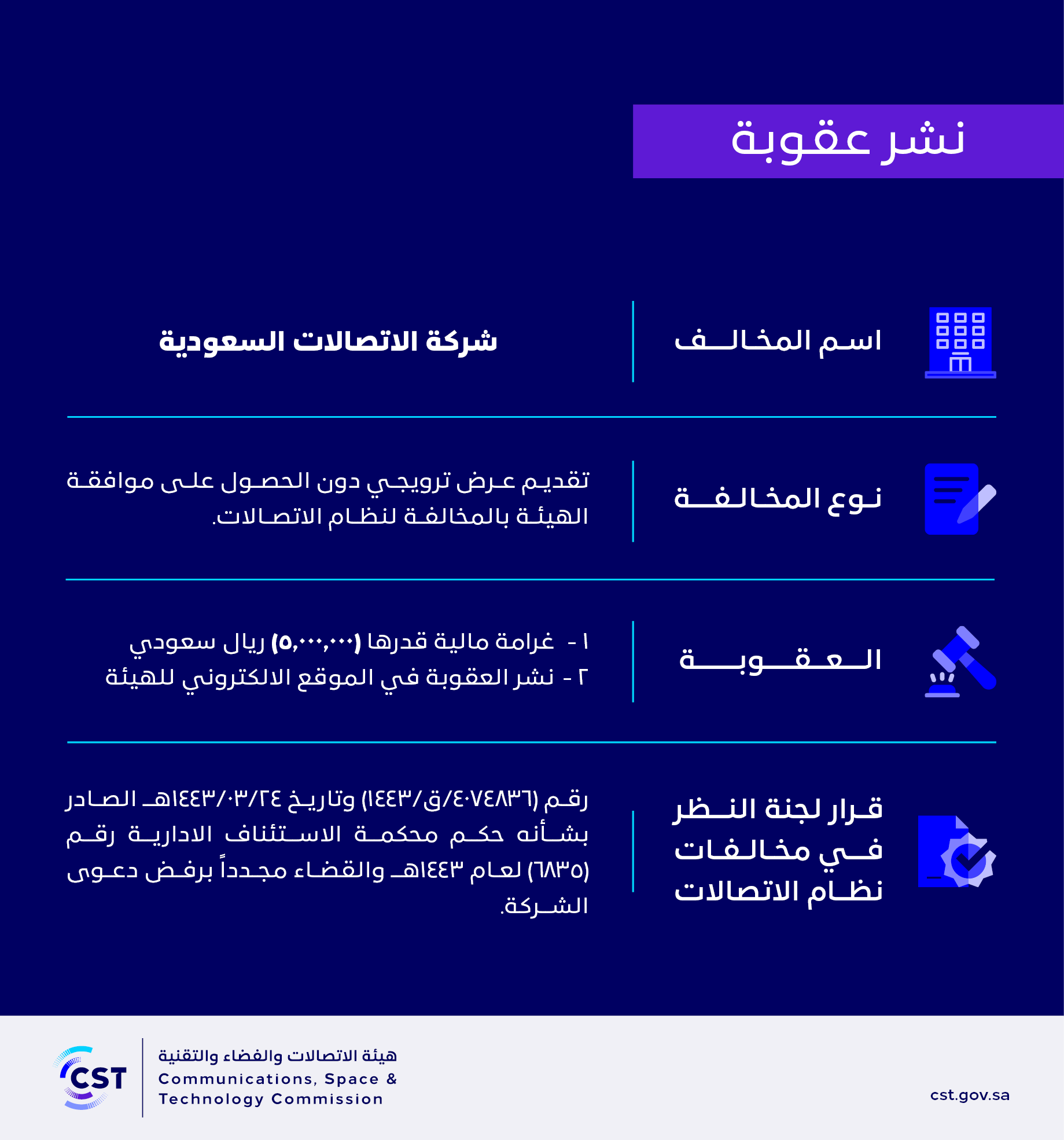 The Communications and Information Technology Commission publishes the decision of the Committee for Reviewing Communications System Violations No. (4074836/Q/1443 AH) regarding (the Saudi Telecom Company)’s violation of the communications system