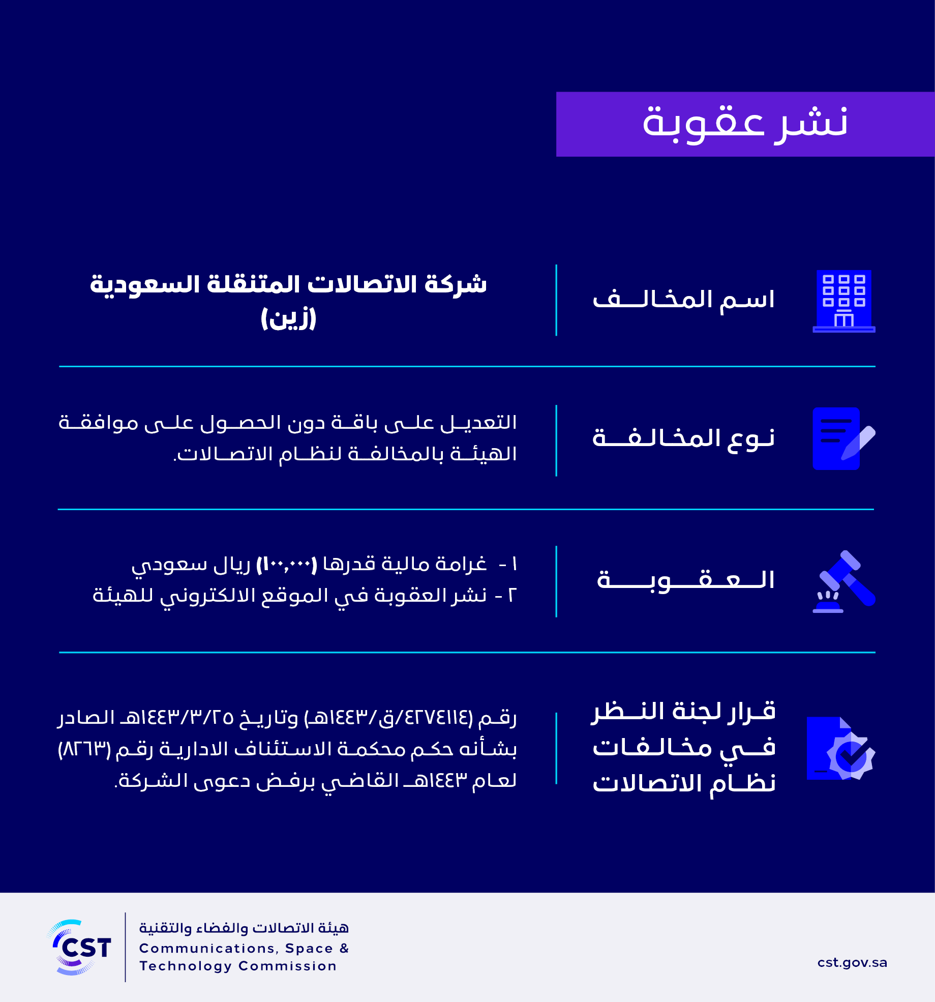 The Communications and Information Technology Commission publishes the decision of the Committee for Reviewing Communications System Violations No. (4274114/Q/1443) regarding (Saudi Mobile Telecommunications Company - Zain)’s violation of the communications system.