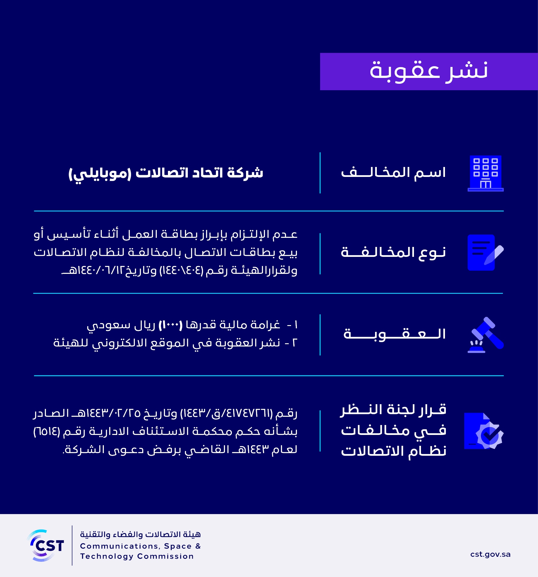 The Communications and Information Technology Commission publishes the decision of the Committee for Reviewing Communications System Violations No. (41747261/Q/1443 AH) regarding (Etihad Etisalat Company - Mobily)’s violation of the communications system.
