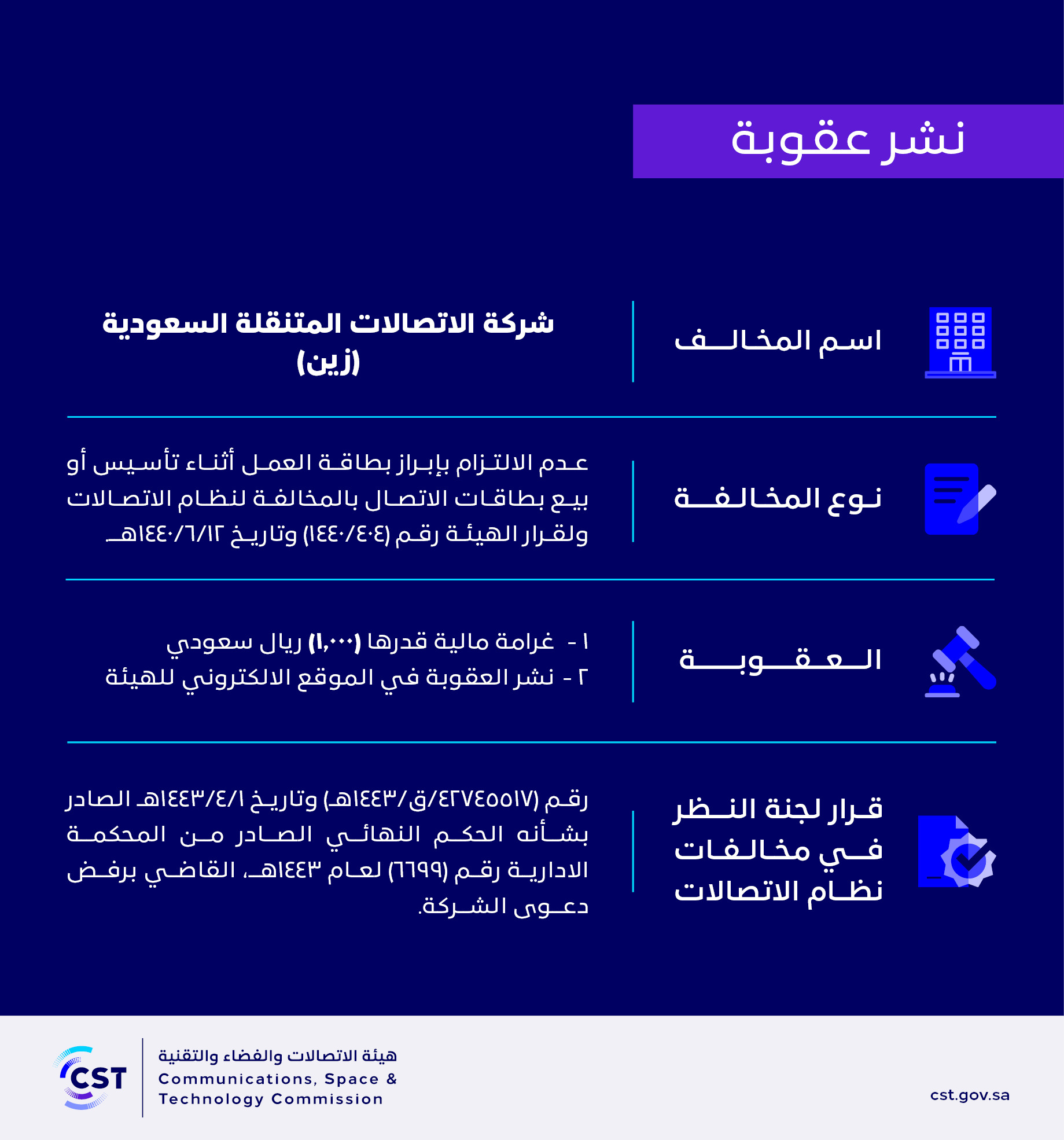 The Communications and Information Technology Commission publishes the decision of the Committee for Reviewing Communications System Violations No. (42745517/Q/1443) regarding (Saudi Mobile Telecommunications Company - Zain)’s violation of the communications system.