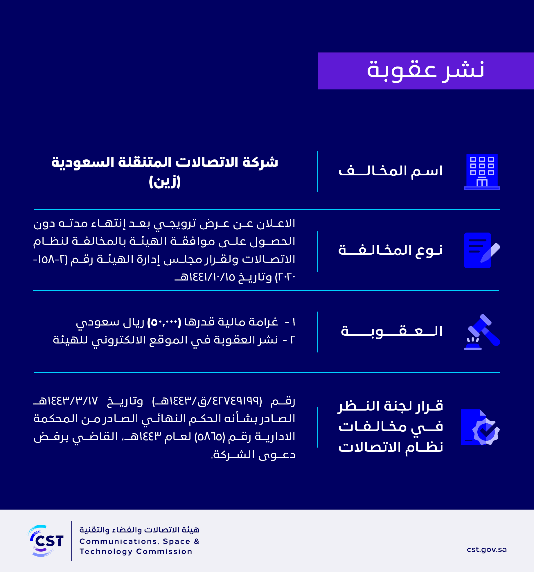 The Communications and Information Technology Commission publishes the decision of the Committee for Reviewing Communications System Violations No. (42749199/Q/1443) regarding (Saudi Mobile Telecommunications Company - Zain)’s violation of the communications system.