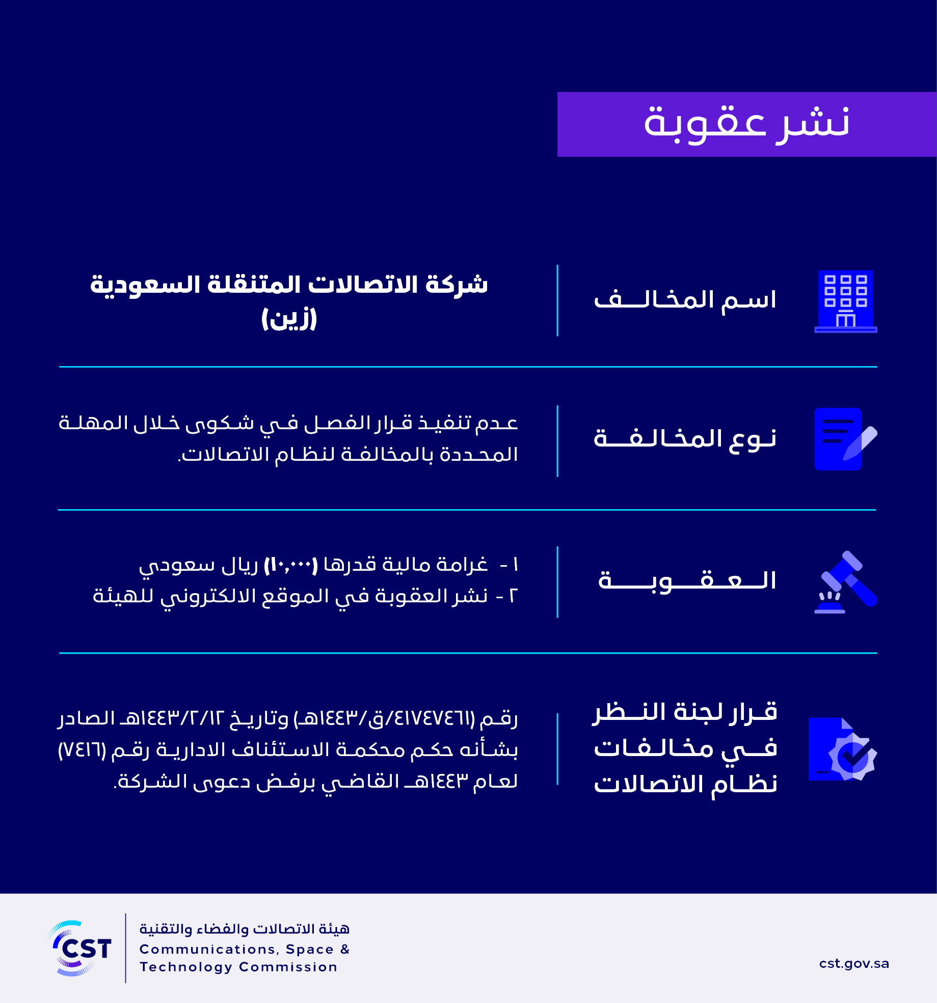 The Communications and Information Technology Commission publishes the decision of the Committee for Review of Communications System Violations No. (41747461/Q/1443) regarding (Saudi Mobile Telecommunications Company - Zain) violation of the communications system.