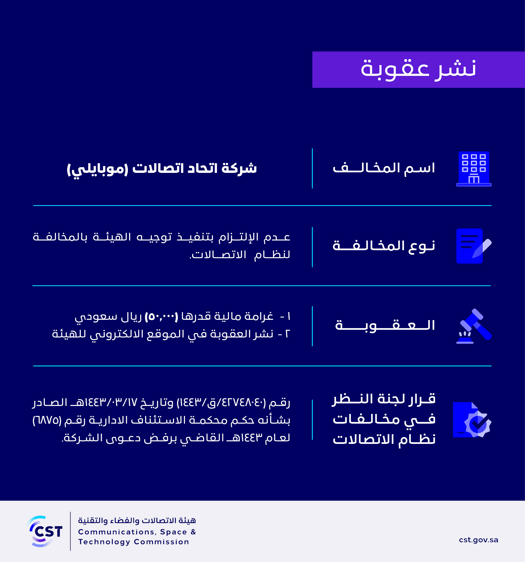 The Communications and Information Technology Commission publishes the decision of the Committee for Reviewing Communications System Violations No. (42748040/Q/1443 AH) regarding (Etihad Etisalat Company - Mobily)’s violation of the communications system.
