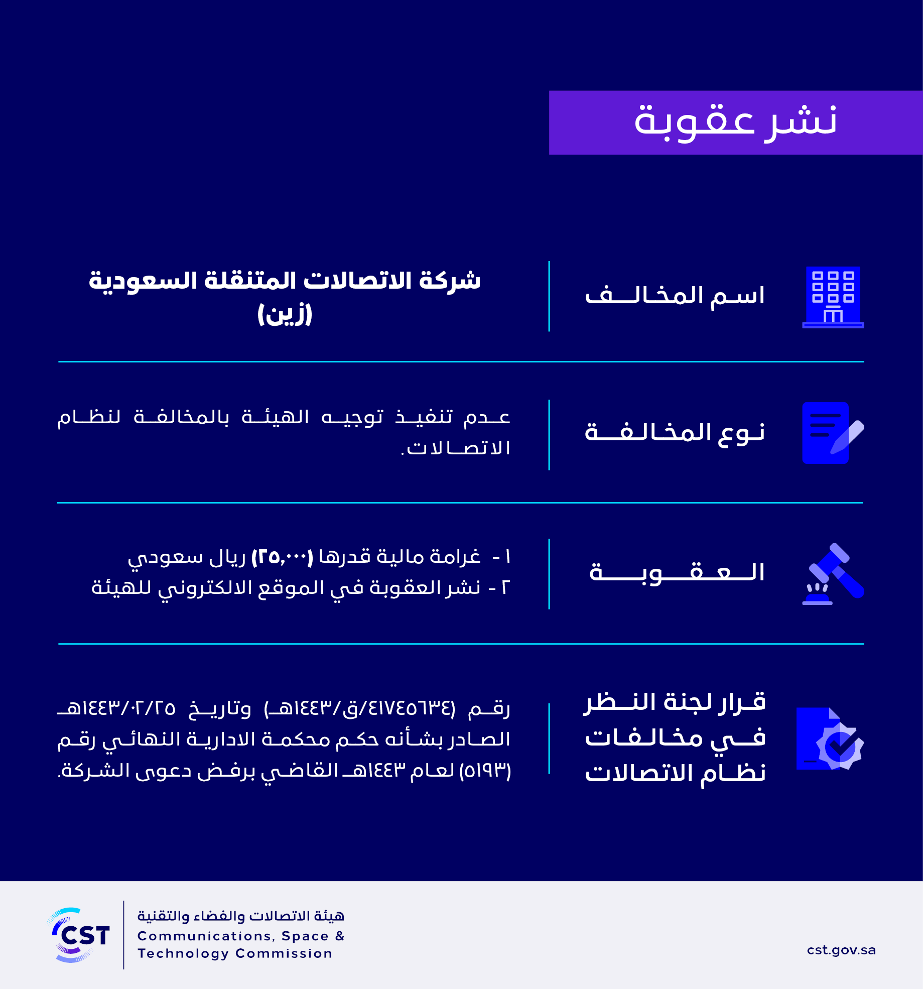 The Communications and Information Technology Commission publishes the decision of the Committee for Review of Communications System Violations No. (41745634/Q/1443 AH) regarding (Saudi Mobile Telecommunications Company - Zain) violation of the communications system.