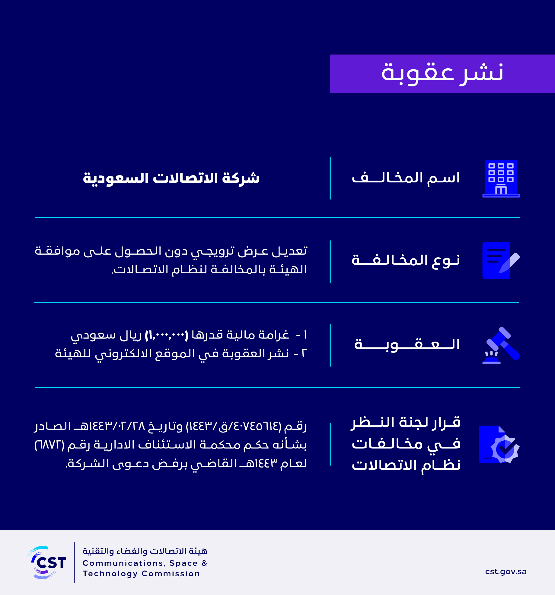 The Communications and Information Technology Commission publishes the decision of the Committee for Review of Communications System Violations No. (40745614/Q/1443 AH) regarding (the Saudi Telecom Company)’s violation of the communications system.