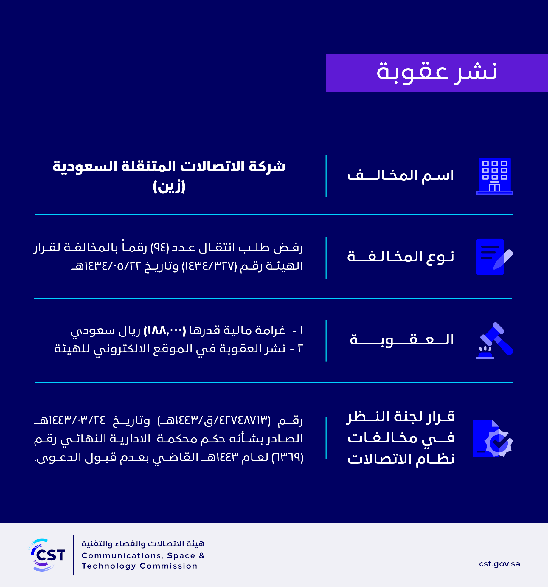 The Communications and Information Technology Commission publishes the decision of the Committee for Reviewing Communications System Violations No. (42748713/Q/1443 AH) regarding (Saudi Mobile Telecommunications Company - Zain)’s violation of the communications system.