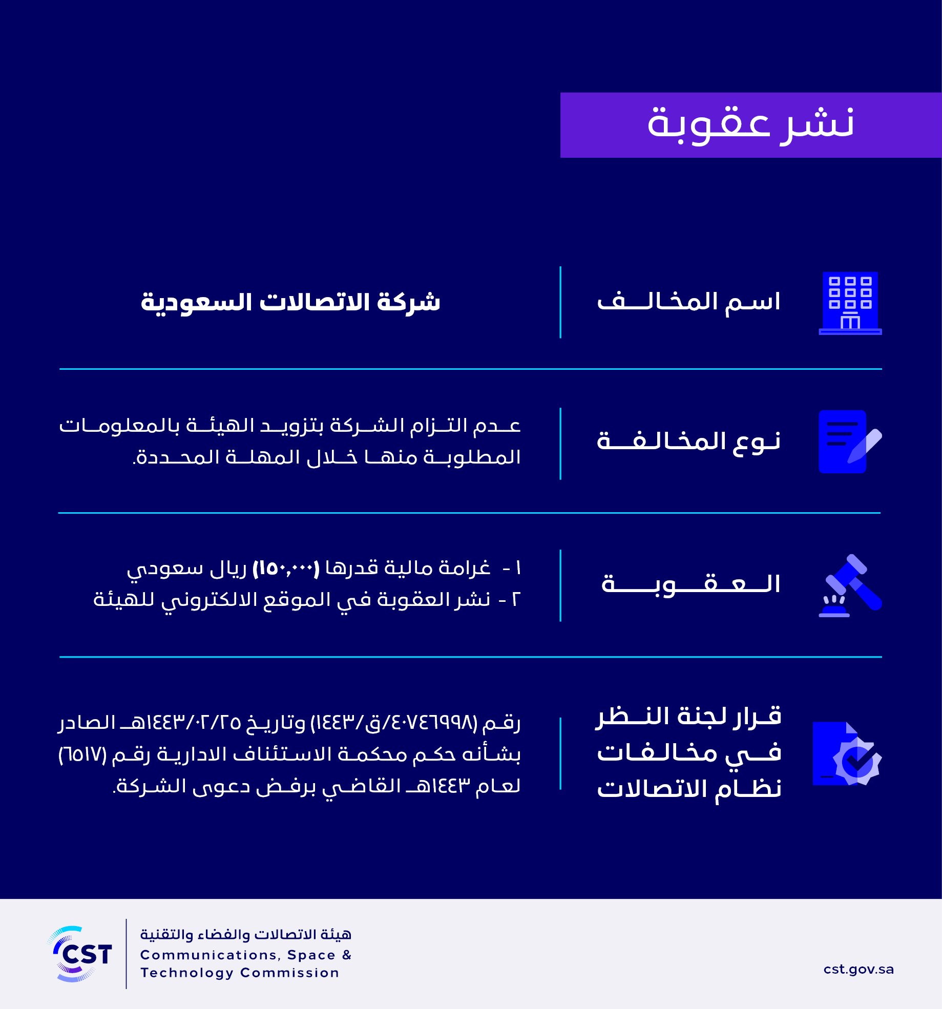 The Communications and Information Technology Commission publishes the decision of the Committee for Reviewing Communications System Violations No. (40746998/Q/1443 AH) regarding (the Saudi Telecom Company)’s violation of the communications system