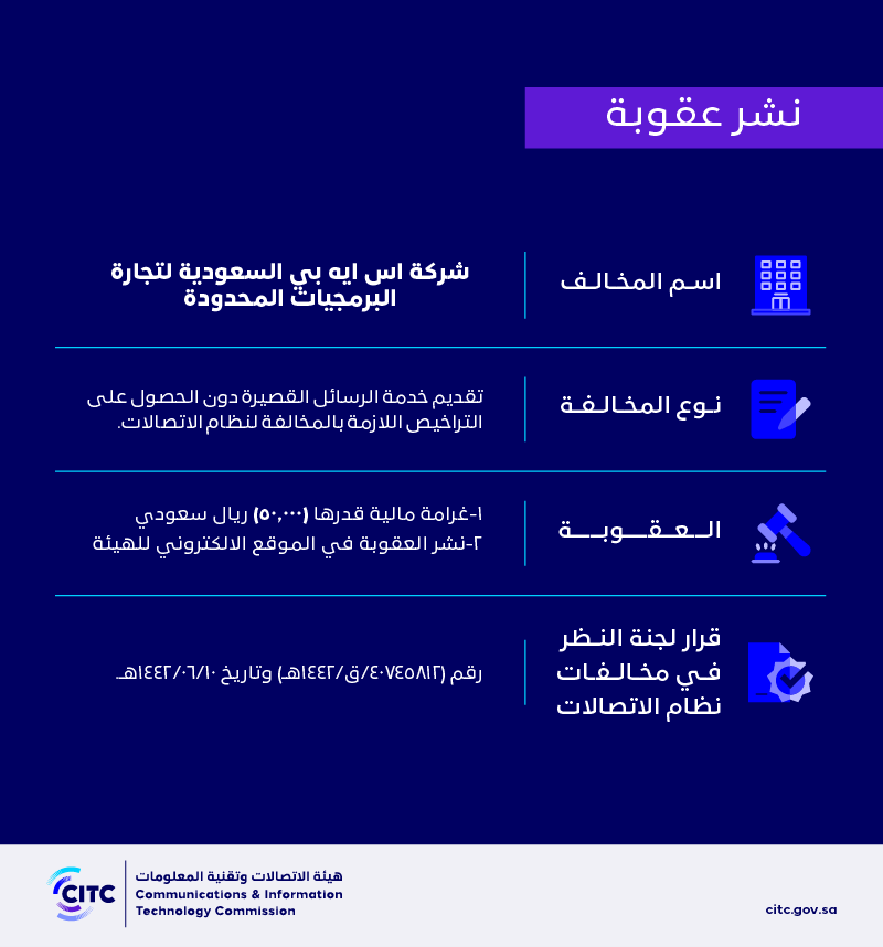 The Communications and Information Technology Commission publishes the decision of the Committee for Reviewing Communications System Violations No. (40745812 /Q/1442 AH) regarding (SAB Saudi Trading Company)’s violation of the communications system