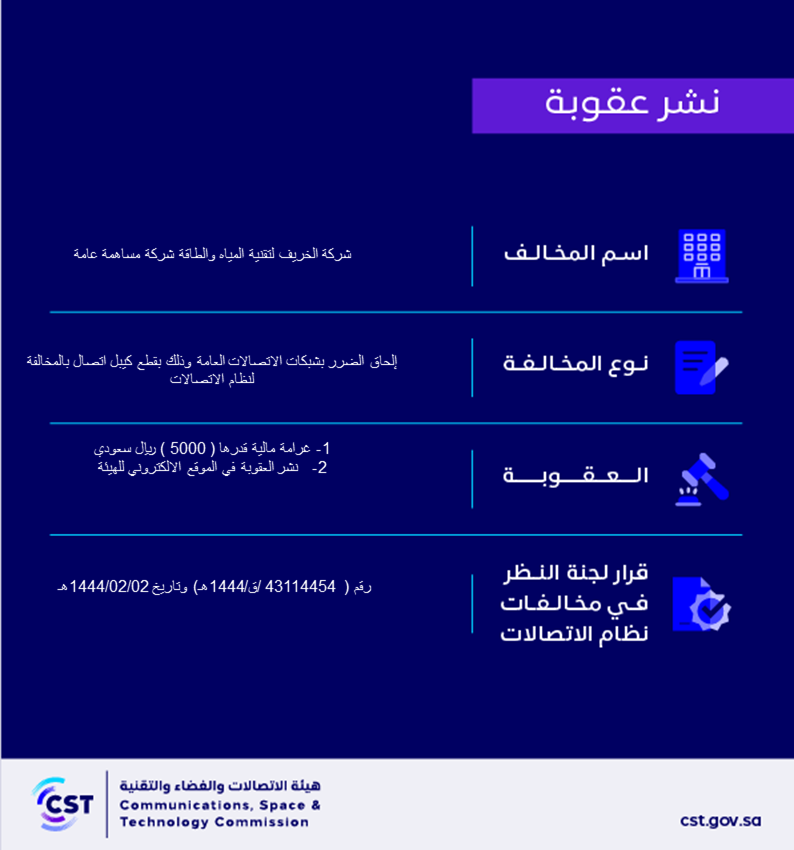 The Communications and Information Technology Commission publishes the decision of the Committee for Reviewing Communications System Violations No. (43114454 / Q / 1444 AH) regarding (Al-Khorayef Water and Energy Technology Company, a public joint stock company) violation of the communications system.