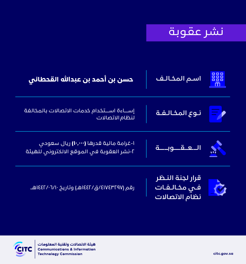 The Communications and Information Technology Commission publishes the decision of the Committee for Reviewing Communications System Violations No. (41743297 / Q / 1442 AH) regarding Hassan bin Ahmed bin Abdullah Al-Qahtani’s violation of the communications system.