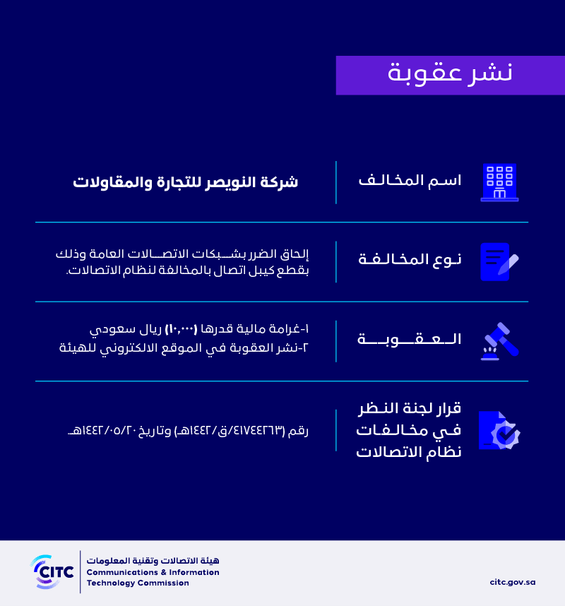 The Communications and Information Technology Commission publishes the decision of the Committee for Reviewing Communications System Violations No. (41744263/Q/1442 AH) regarding (Al-Nwaisir Trading and Contracting Company)’s violation of the communications system.