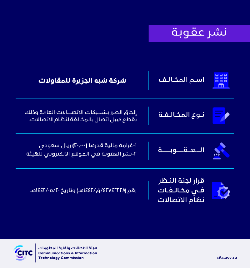 The Communications and Information Technology Commission publishes the decision of the Committee for Reviewing Communications System Violations No. (42742228/Q/1442 AH) regarding (Peninsula Contracting Company)’s violation of the communications system.
