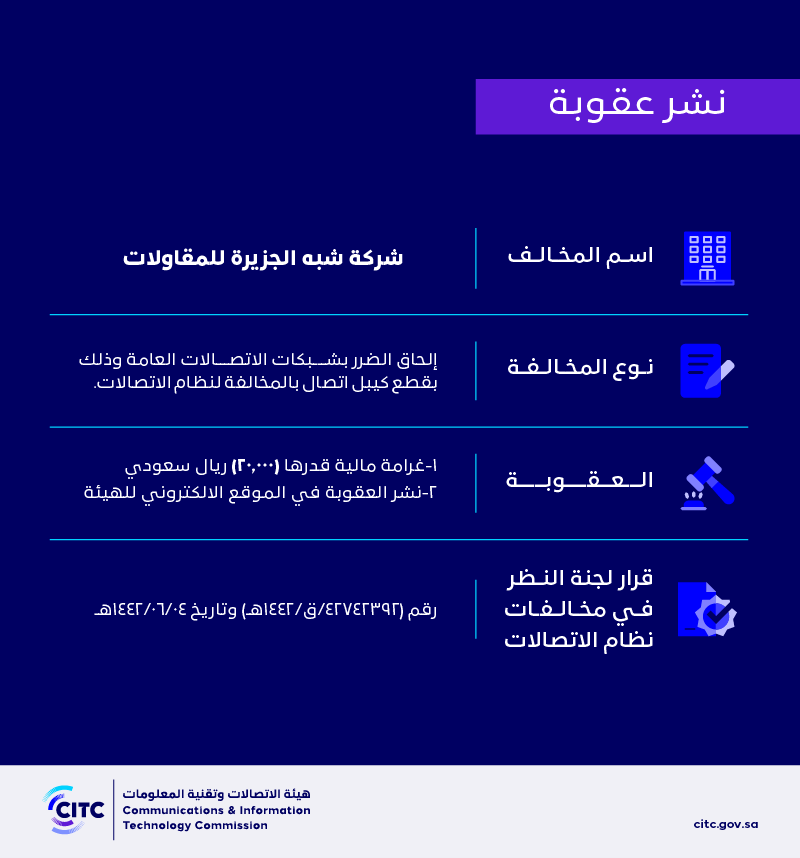 The Communications and Information Technology Commission publishes the decision of the Committee to Consider Violations of the Communications System No. (42742392/Q/1442 AH) regarding (Shebah Al-Jazeera Contracting Company)’s violation of the communications system