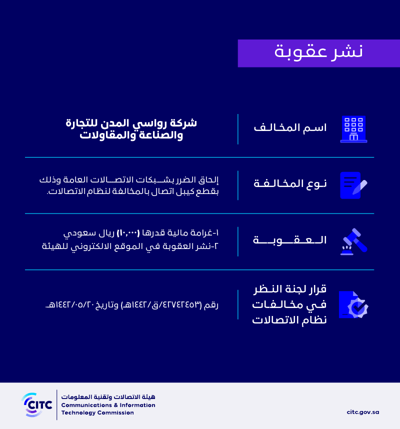 The Communications and Information Technology Commission publishes the decision of the Committee for Reviewing Communications System Violations No. (42742453/Q/1442 AH) regarding (Rawasi Al Madin Trading, Industry and Contracting Company)’s violation of the communications system.