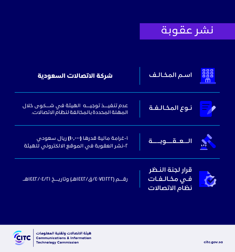 The Communications and Information Technology Commission publishes the decision of the Committee for Review of Communications System Violations No. (40741222/Q/2144 AH) regarding (the Saudi Telecom Company)’s violation of the communications system.