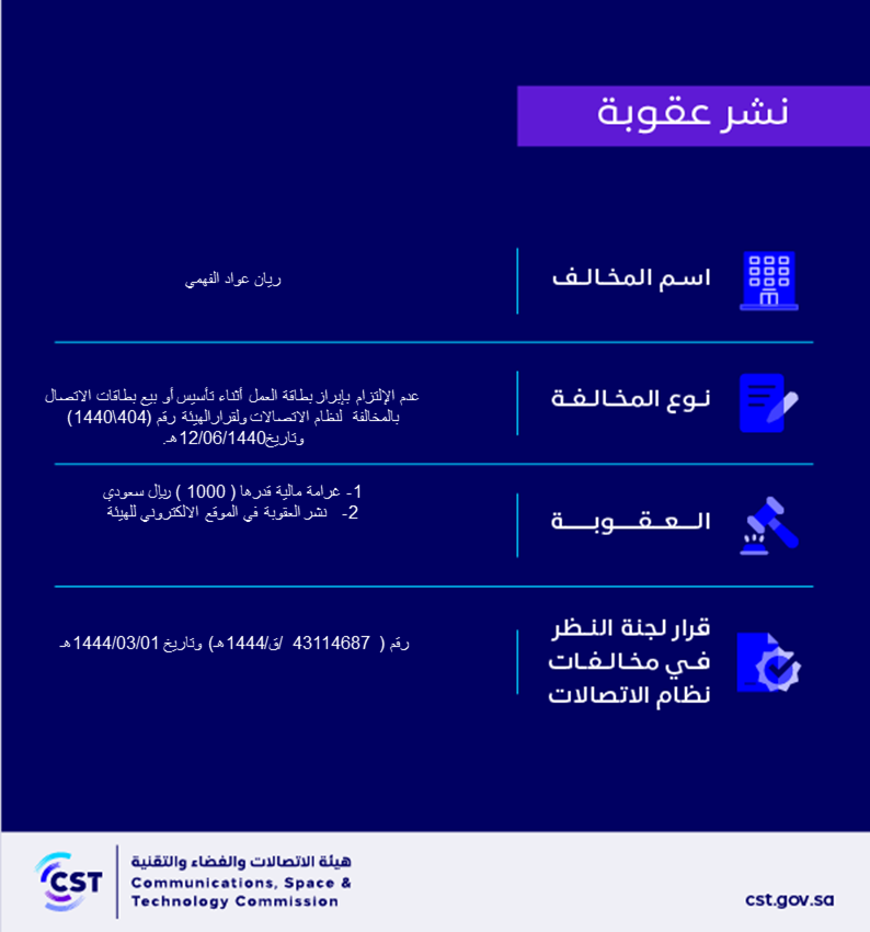 The Communications and Information Technology Commission publishes the decision of the Committee for Reviewing Communications System Violations No. (43114687 / Q / 1444 AH) regarding Rayyan Awad Al-Fahmi’s violation of the communications system.