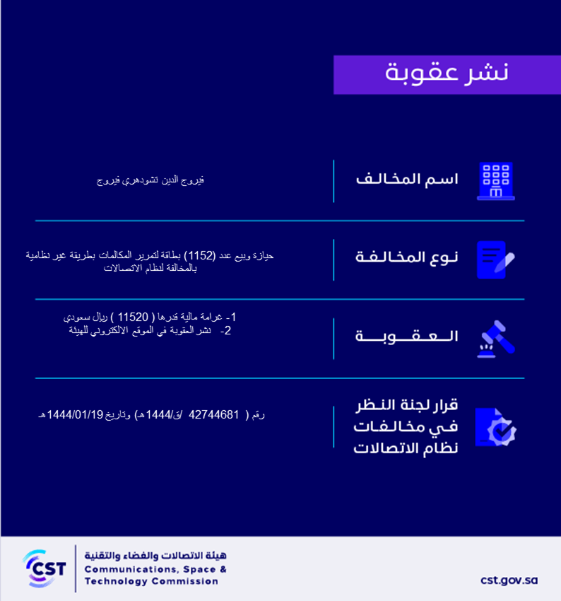 The Communications and Information Technology Commission publishes the decision of the Committee for Reviewing Communications System Violations No. (42744681 / Q / 1444 AH) regarding (Firoj Al-Din Chaudhry Firoj) violation of the communications system
