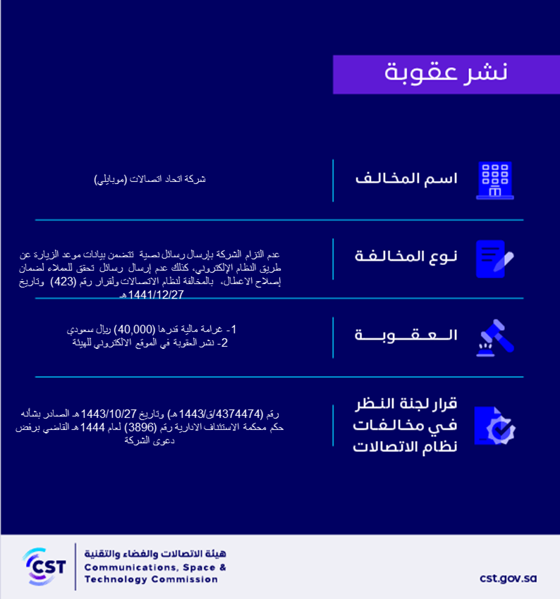 The Communications, Space and Technology Commission publishes the decision of the Committee for Review of Communications System Violations No. (4374474/Q/1443 AH) regarding Etihad Etisalat Company (Mobily)’s violation of the communications system.