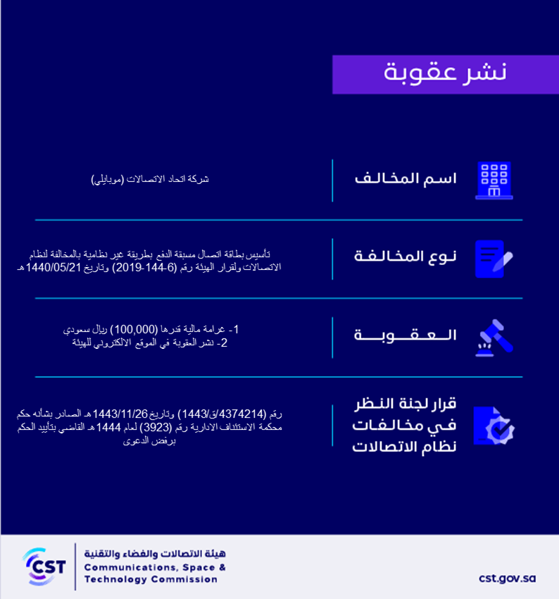 The Communications, Space and Technology Commission publishes the decision of the Committee for Reviewing Communications System Violations No. (4374214/Q/1443) regarding Etihad Telecommunications Company (Mobily)’s violation of the communications system.