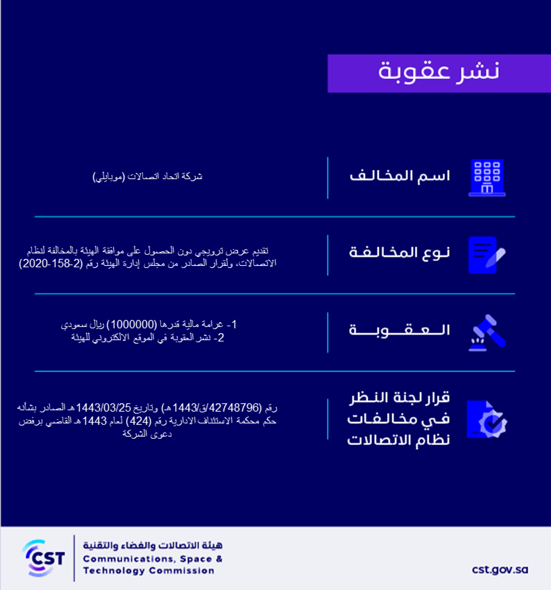 The Communications, Space and Technology Commission publishes the decision of the Committee for Review of Communications System Violations No. (42748796/Q/1443 AH) regarding Etihad Etisalat Company (Mobily)’s violation of the communications system.