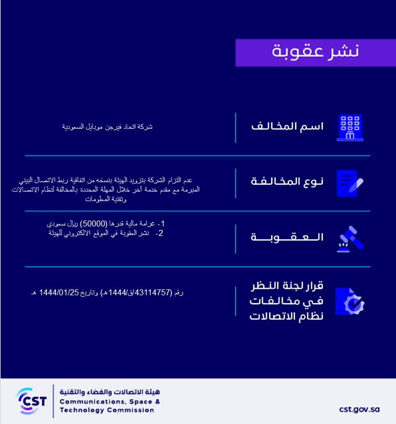 The Communications, Space and Technology Commission publishes the decision of the Committee for Review of Communications System Violations No. (43114757/Q/1444 AH) regarding Virgin Mobile Saudi Arabia’s violation of the communications system.