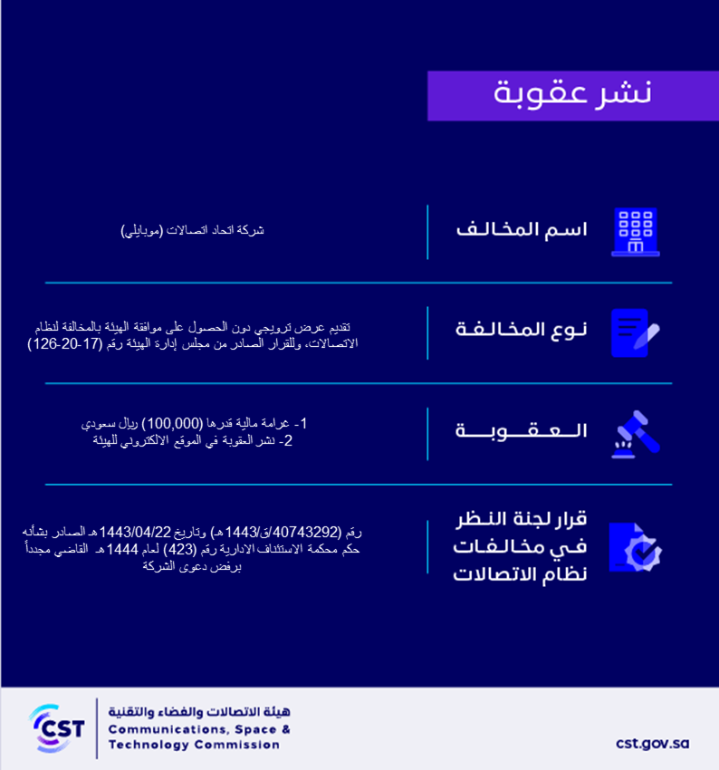 The Communications, Space and Technology Commission publishes the decision of the Committee for Review of Communications System Violations No. (40743292/Q/1443 AH) regarding Etihad Etisalat Company (Mobily)’s violation of the communications system.