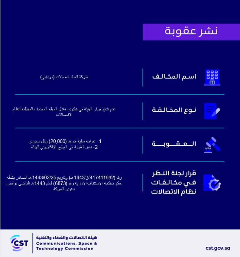 The Communications, Space and Technology Commission publishes the decision of the Committee for Review of Communications System Violations No. (417411692/Q/1443 AH) regarding Etihad Etisalat Company (Mobily)’s violation of the communications system.