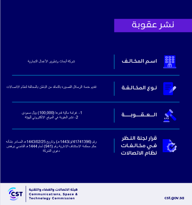 The Communications, Space and Technology Commission publishes the decision of the Committee for Review of Communications System Violations No. (41741396/Q/1443 AH) regarding the Business Research and Development Company’s violation of the communications system.