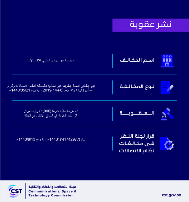 The Communications, Space and Technology Commission publishes the decision of the Committee for Review of Communications System Violations No. (41742977/Q/1443 AH) regarding Badr Awad Al Otaibi Communications Foundation’s violation of the communications system.