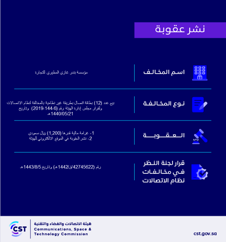 The Communications, Space and Technology Commission publishes the decision of the Committee for Review of Communications System Violations No. (42745622/Q/1442 AH) regarding Bandar Ghazi Al-Mutairi Trading Establishment’s violation of the communications system.