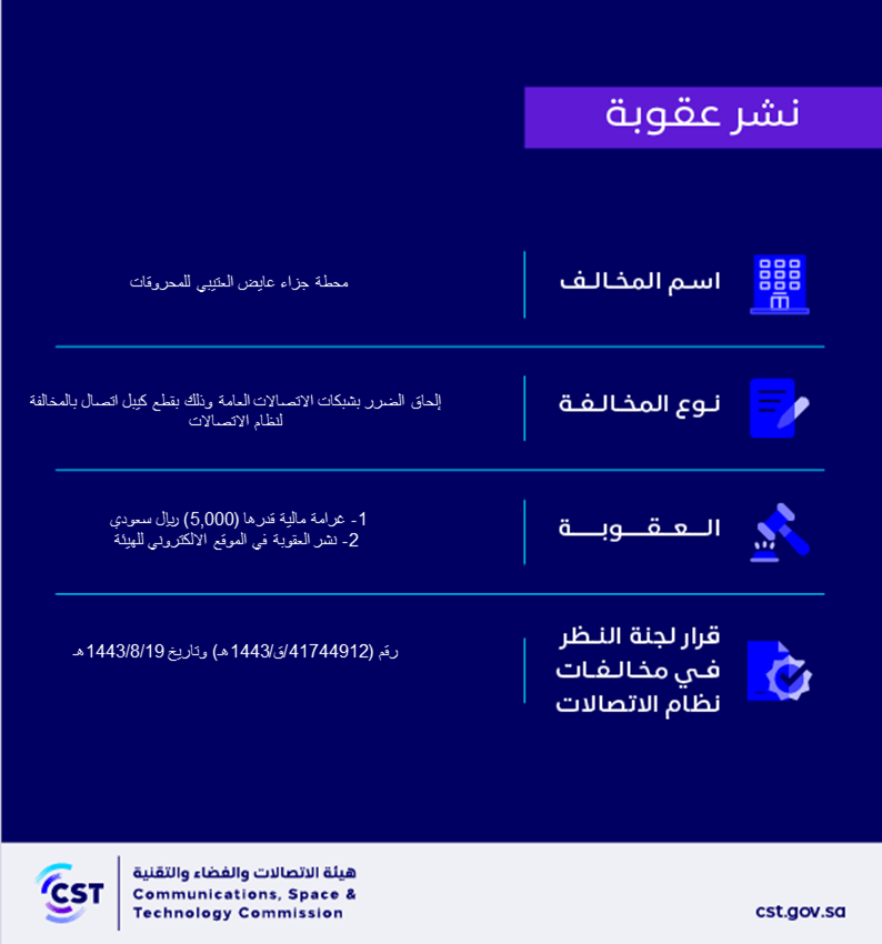 The Communications, Space and Technology Commission publishes the decision of the Committee for Review of Communications System Violations No. (41744912/Q/1443 AH) regarding the violation of the communications system by the Ayed Al Otaibi Fuel Penal Station.