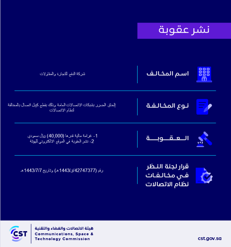 The Communications, Space and Technology Commission publishes the decision of the Committee for Review of Communications System Violations No. (42747377/Q/1443 AH) regarding Al-Dafa Trading and Contracting Company’s violation of the communications system.
