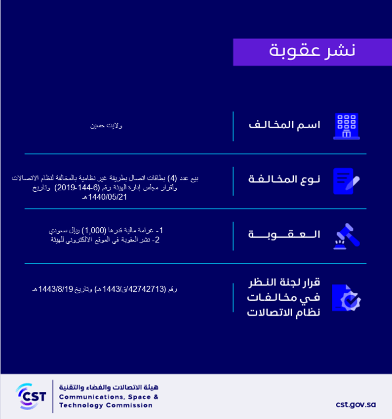 The Communications, Space and Technology Commission publishes the decision of the Committee for Review of Communications System Violations No. (42742713/Q/1443 AH) regarding Wilayat Hussein’s violation of the communications system