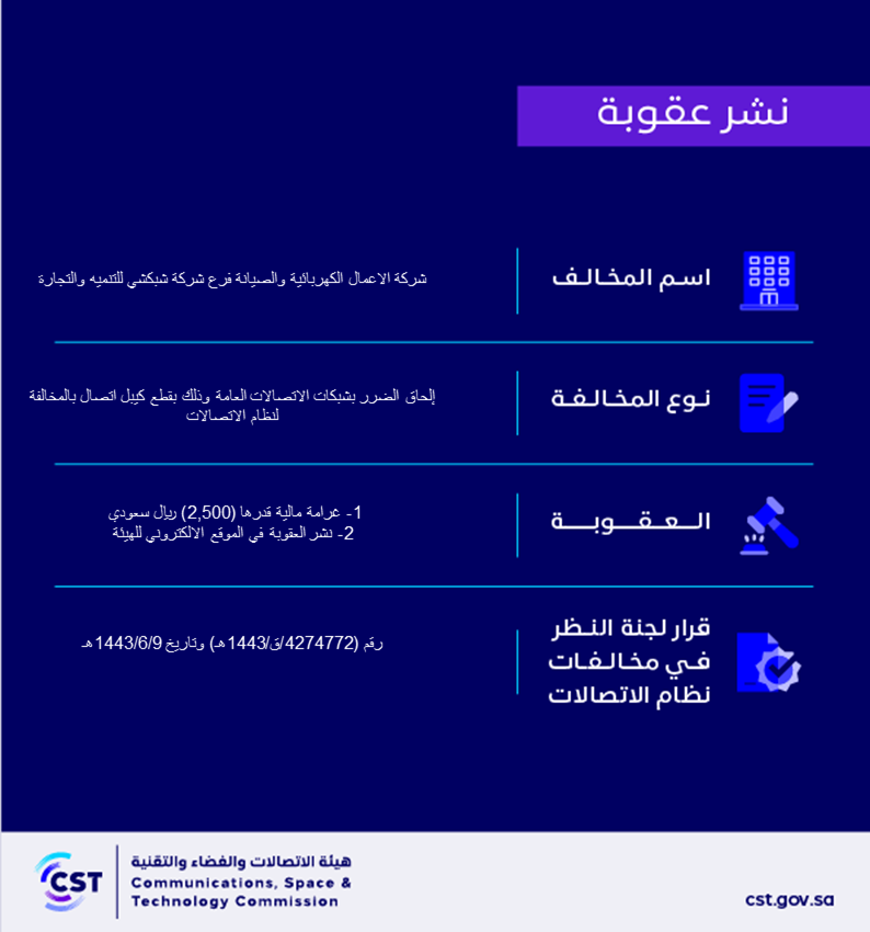 The Communications, Space and Technology Commission publishes the decision of the Committee for Review of Communications System Violations No. (4274772/Q/1443 AH) regarding the Electrical Works and Maintenance Company, branch of Shobokshi Development and Trade Company, violating the communications system.