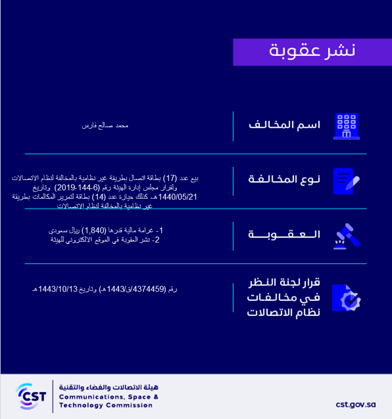 The Communications, Space and Technology Commission publishes the decision of the Committee for Review of Communications System Violations No. (4374459/Q/1443 AH) regarding Muhammad Saleh Fares’ violation of the communications system