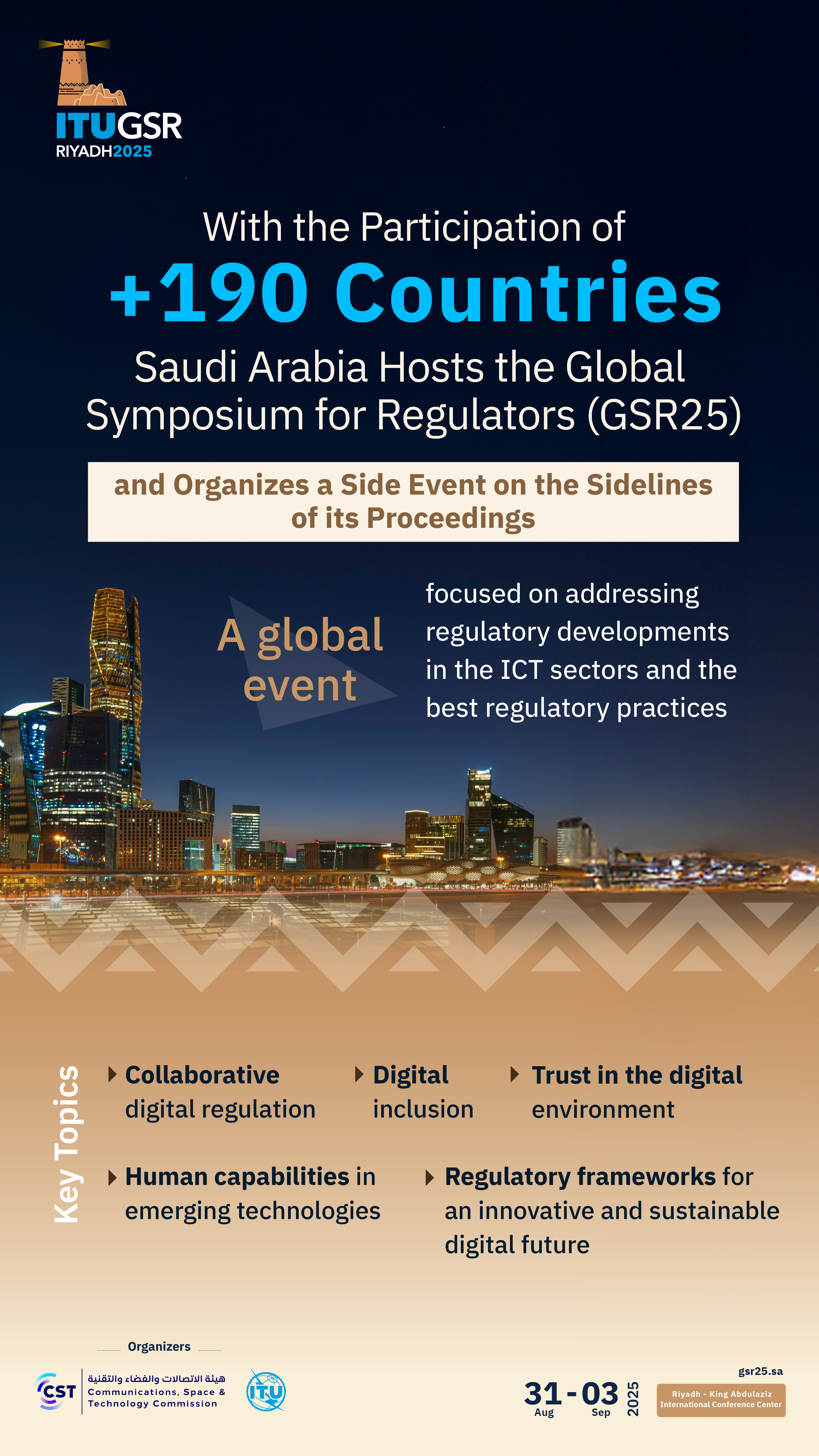 20250519510Saudi Arabia, represented by the Communications, Space & Technology Commission (CST), is hosting the Global Symposium for Regulators (GSR25) with the participation of more than 190 countries, in partnership with the International Telecommunication Union (ITU), under the title: “Regulation for Sustainable Digital Development”. The symposium will take place at the King Abdulaziz International Conference Center in Riyadh from August 31 to September 3, 2025.