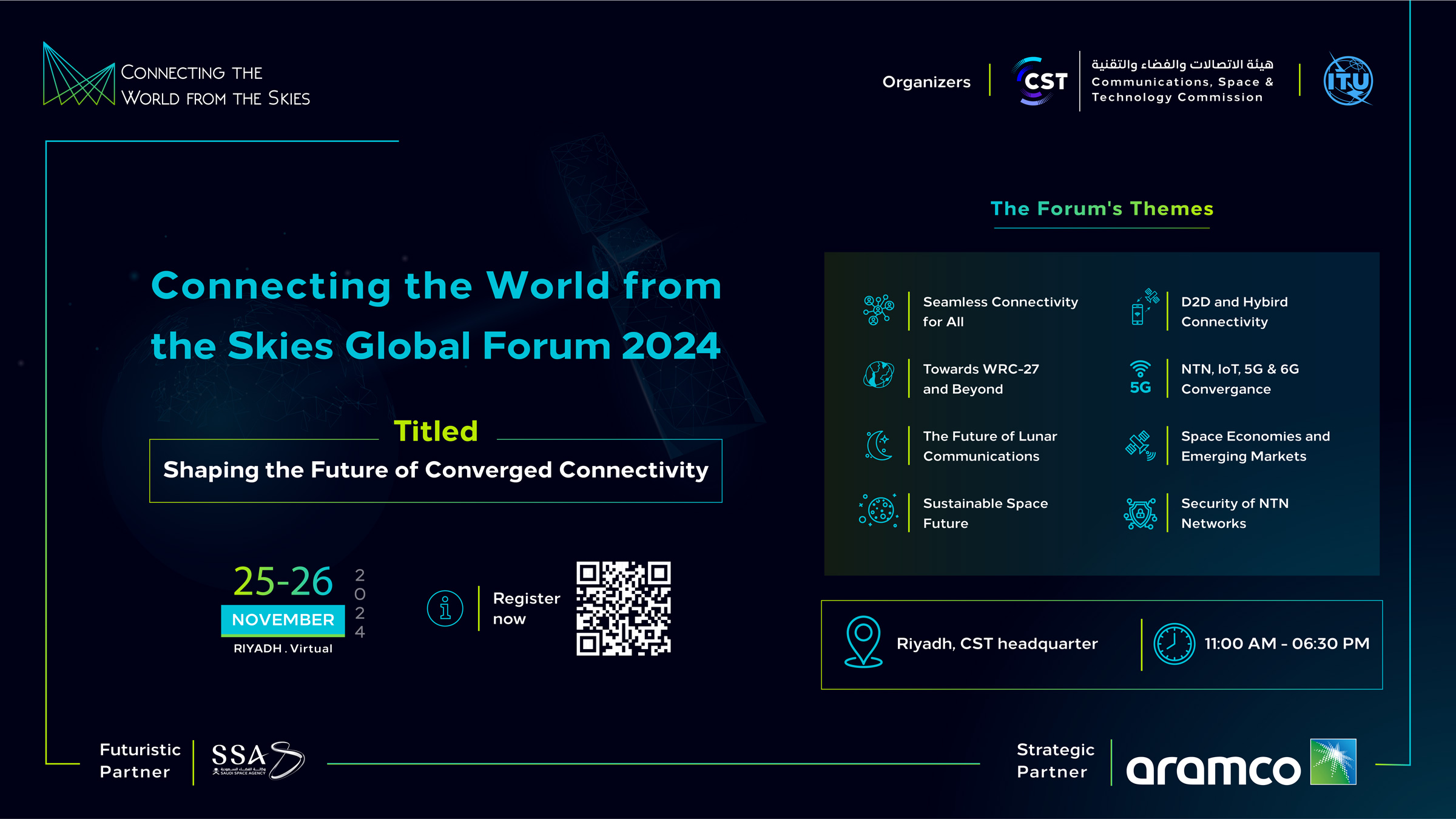 20250519510Under the patronage of H.E. Eng. Abdullah AlSwaha, Minister of Communications and Information Technology, and the Chairman of the Communications, Space and Technology Commission (CST), the “Connecting the World from the Skies” Global Forum 2024 will kick off tomorrow in Riyadh under the title "Shaping the Future of Converged Connectivity", which is organized by CST and the International Telecommunication Union (ITU). The forum aims to keep up with the rapid development of telecom services, provide digital solutions to serve humanity, connect remote areas, and promote research and innovation in NTN technologies. Moreover, it will focus on enabling eco-friendly telecom infrastructure and enhancing the regulation of NTN and its usage in digital transformation.